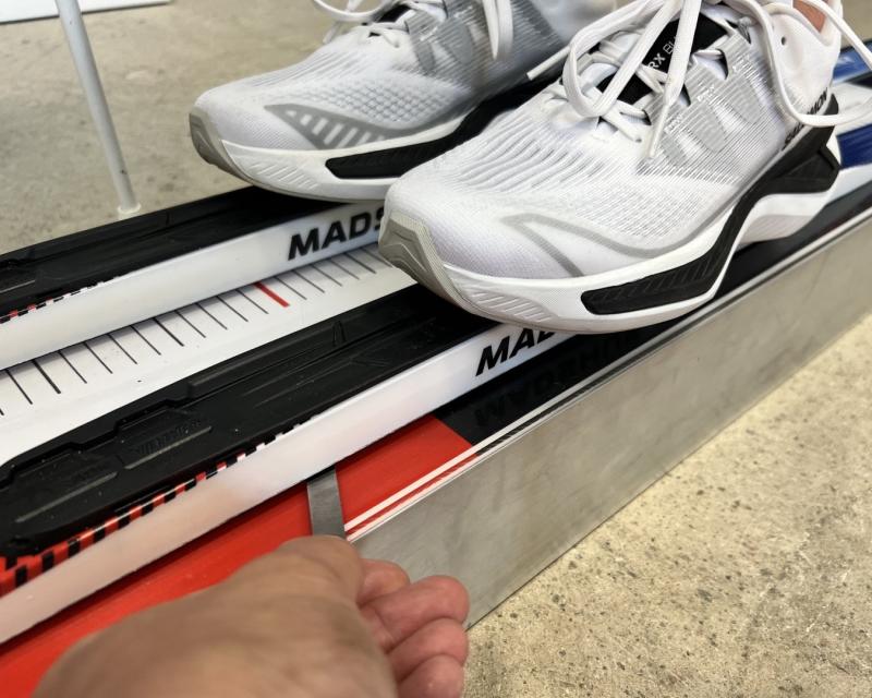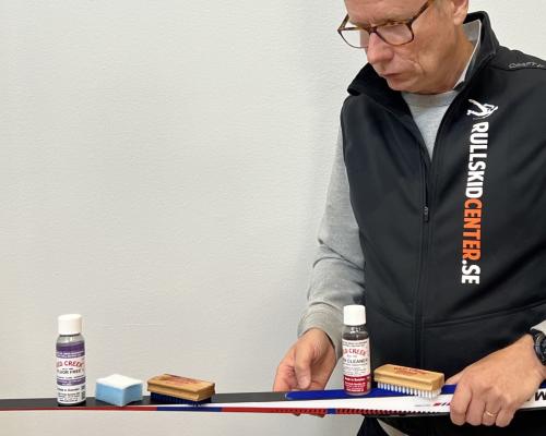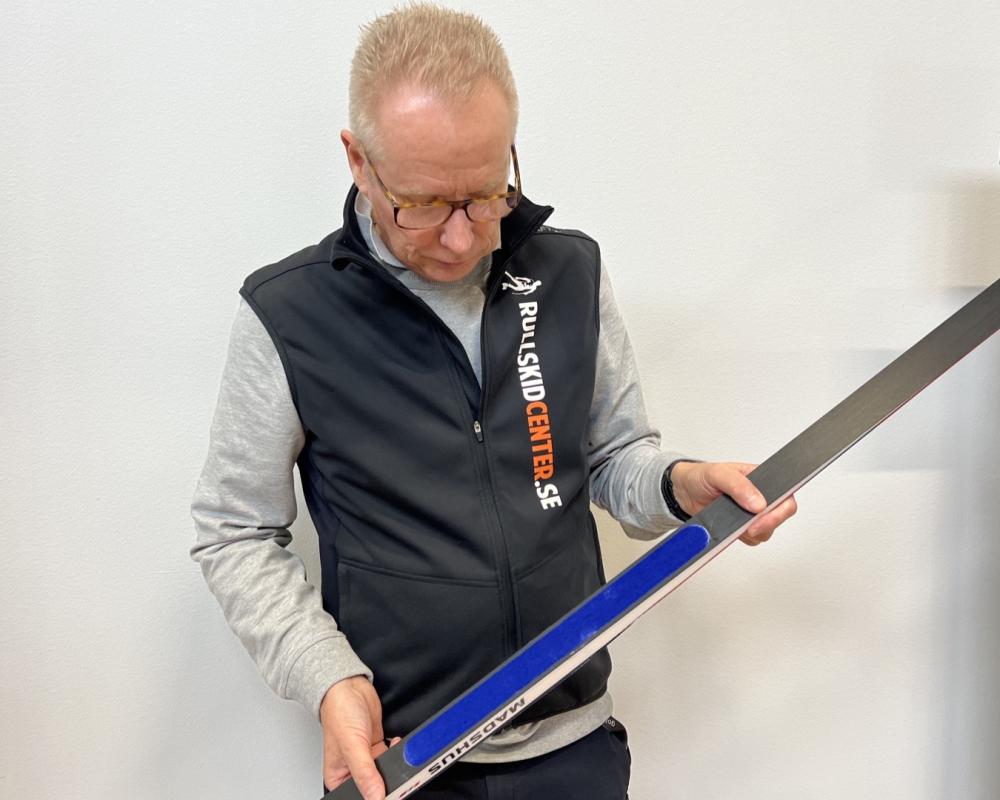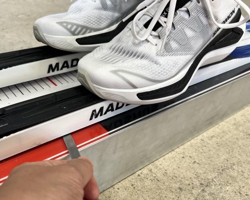 För att längdskidorna ska fungera som det är tänkt i snön, så kontrollerar man spannet på en plan spannbräda.