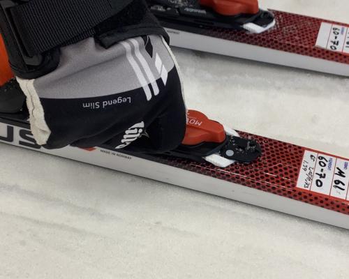 Man kontrollerar även fästet genom att man flyttar över vikten på ena foten och trycker ner framdelen av foten. Då ska bladmåttet bli fastkilat, dvs att skinnet trycks ner i snön och ger fäste.